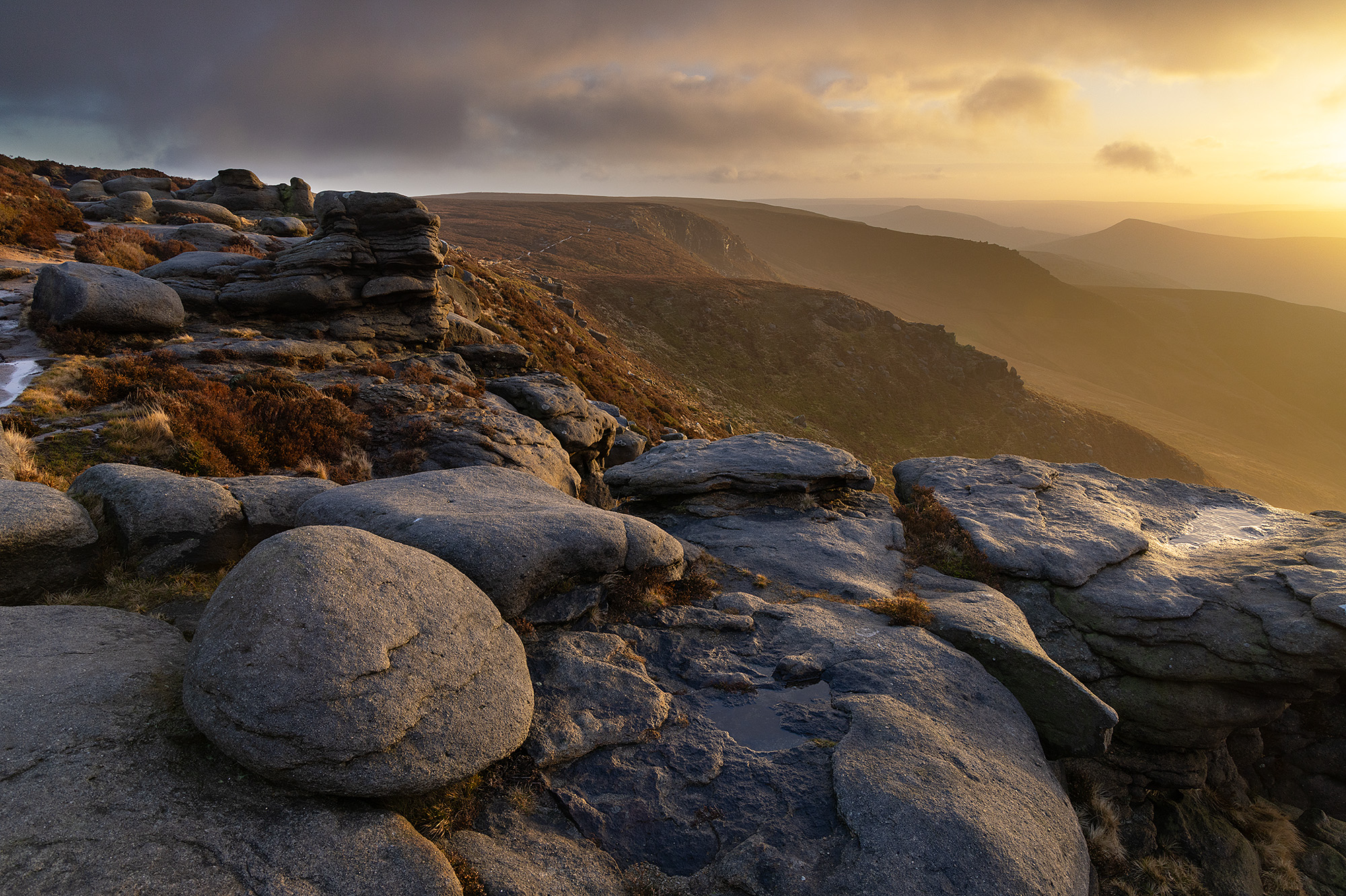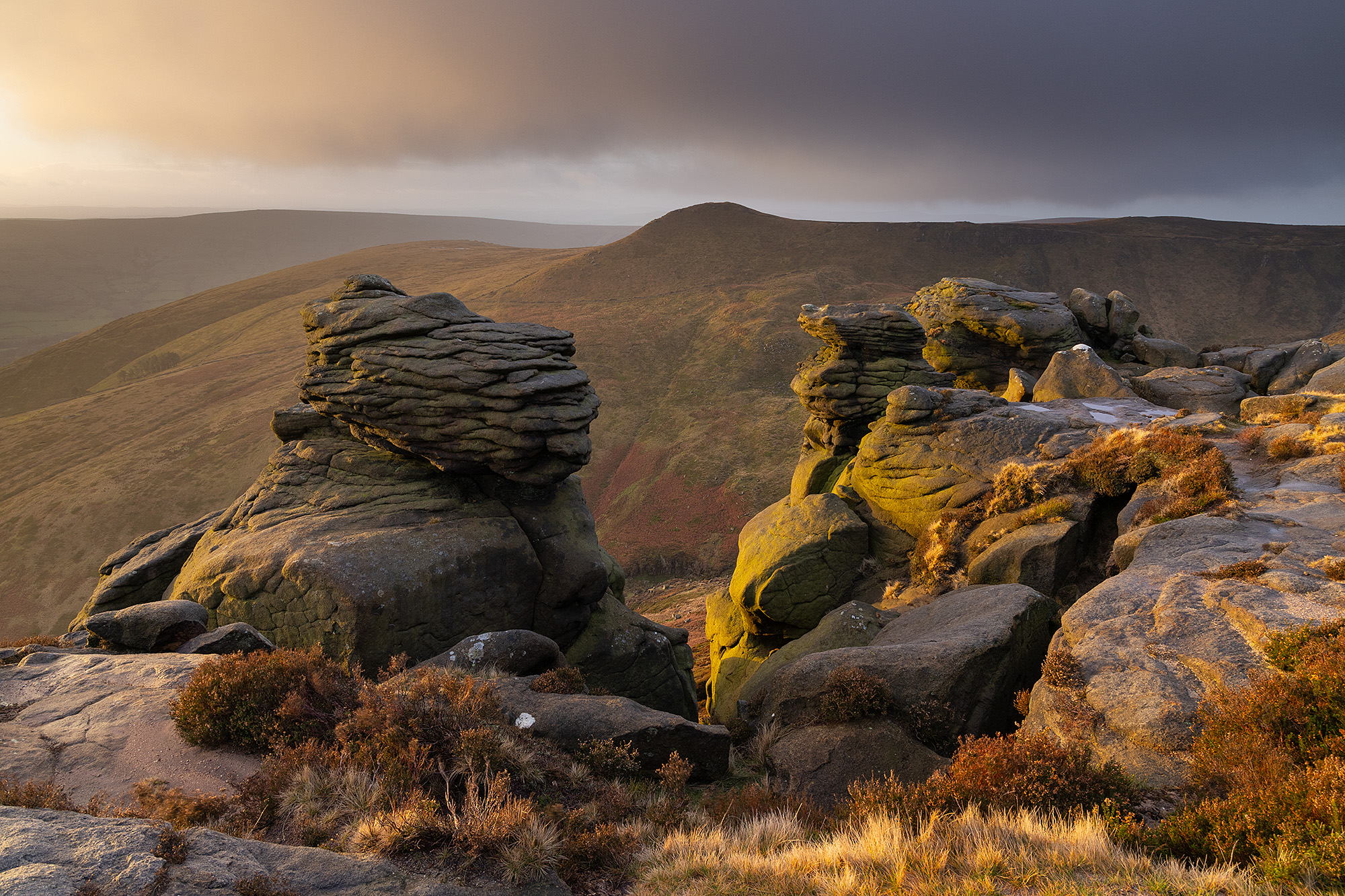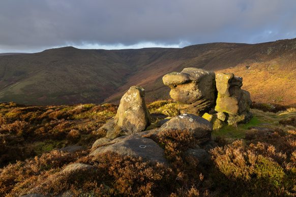 The Dark Peak is mostly gritstone and moorland. This is the largest area of the Peak District and I’ve split it into Northern and Eastern. The Northern section includes Kinder Scout, The Great Ridge with Mam Tor, Back Tor, Lose Hill, Win Hill and Bleaklow. The landscape includes high moorland, gritstone edges and huge shale landslips.
